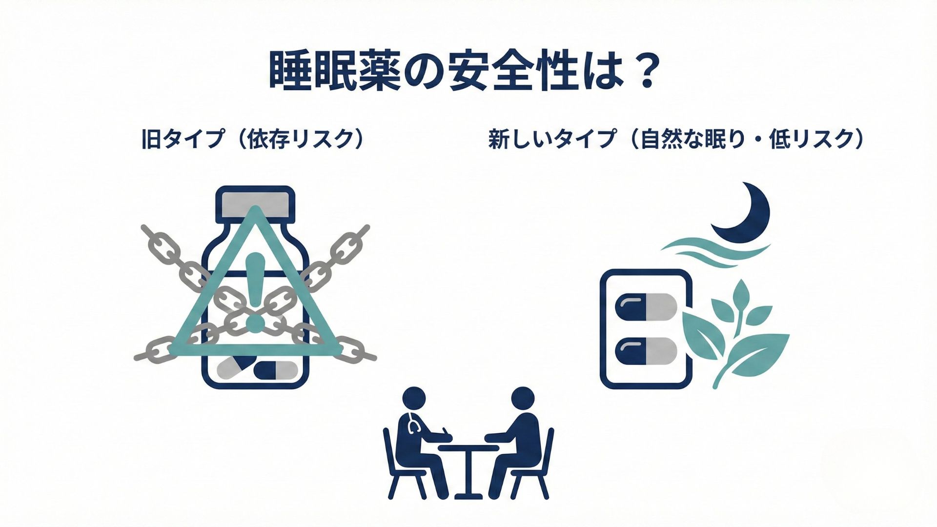 古いタイプの睡眠薬(ベンゾジアゼピン系)には依存やふらつきのリスクがありますが、現在は依存性のリスクが低い「自然な眠りを誘う薬」の主流となっています。