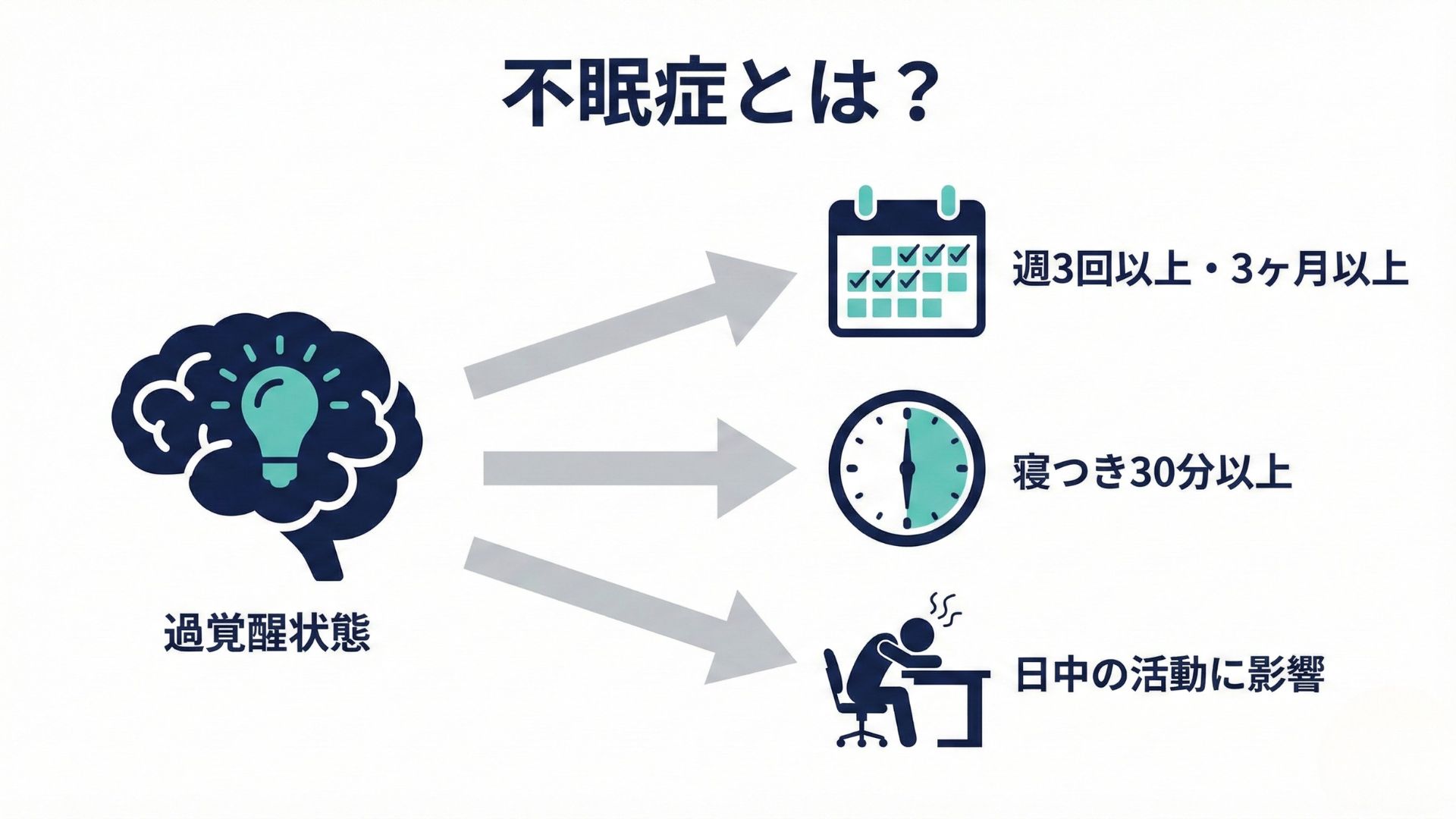 週に3回以上、寝つくまでに30分以上かかる状態が3ヶ月以上続いており、日中の活動への影響があるなら、医学的に治療が必要な不眠症という病気です。