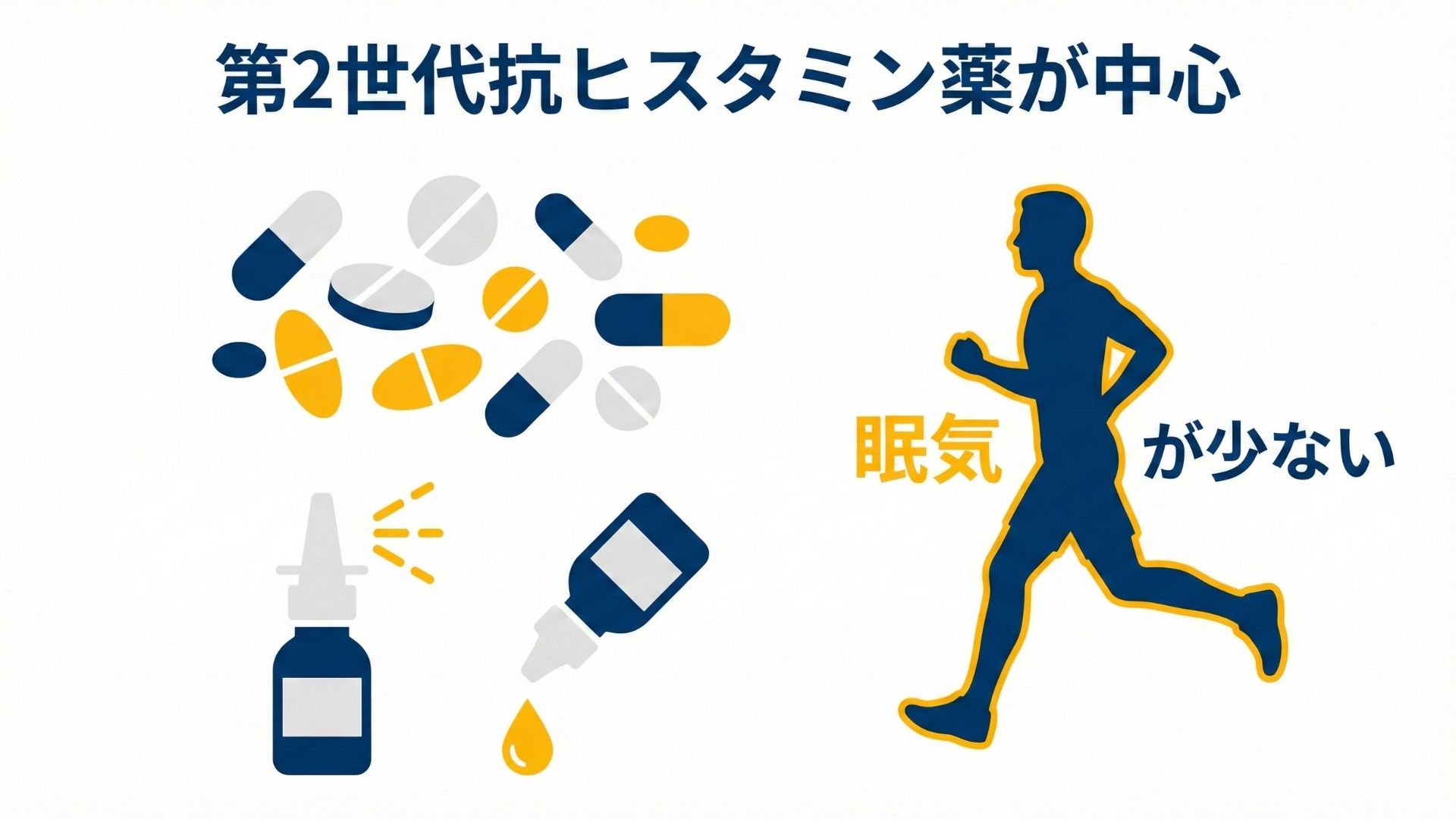 第2世代抗ヒスタミン薬が初期療法の中心となります。