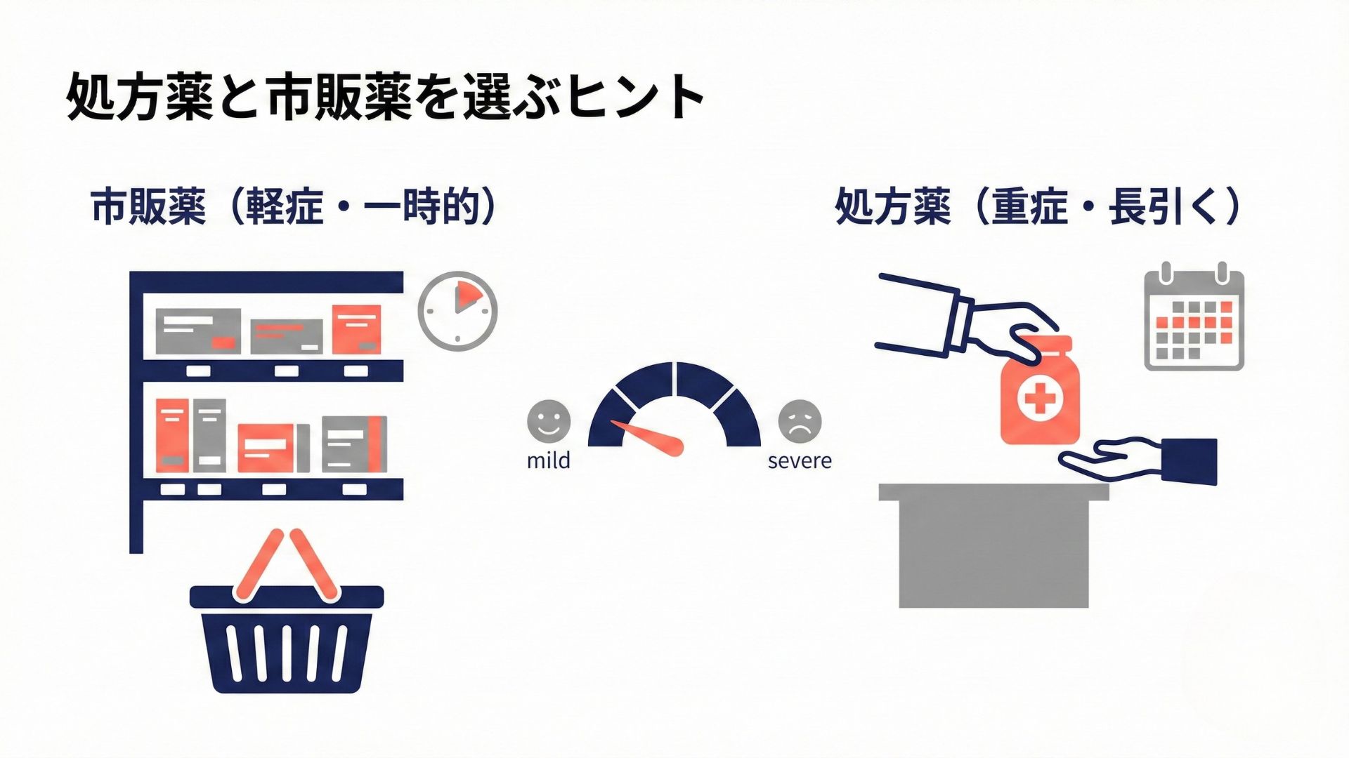 症状が強くて長引くなら処方薬、一時的で軽症なら市販薬が選択肢となります