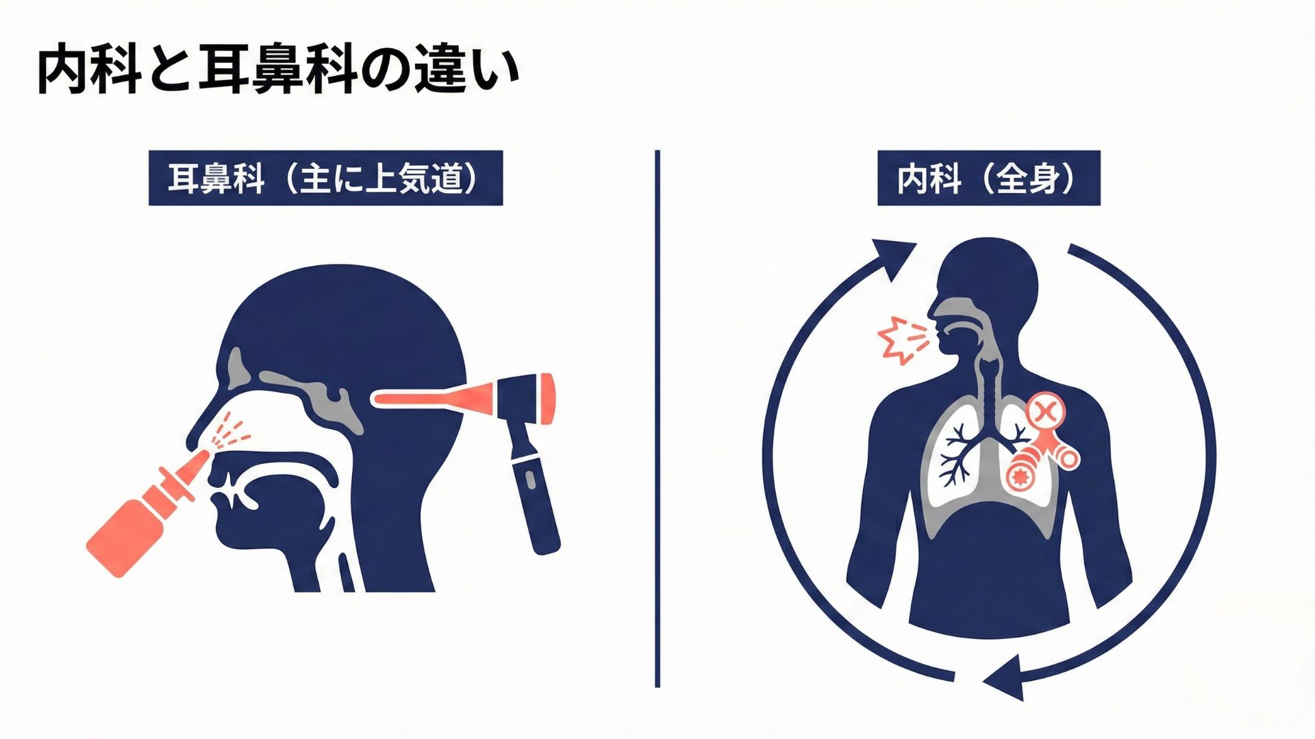 耳鼻咽喉科は、鼻水、鼻づまり、くしゃみといった局所症状に強く、医師が鼻腔内を直接確認しながら点鼻薬や処置を行えるのがメリットです。一方、内科は花粉症を全身のアレルギー反応として捉え、咳、喉の違和感、喘息の傾向なども含めて総合的に評価できます。