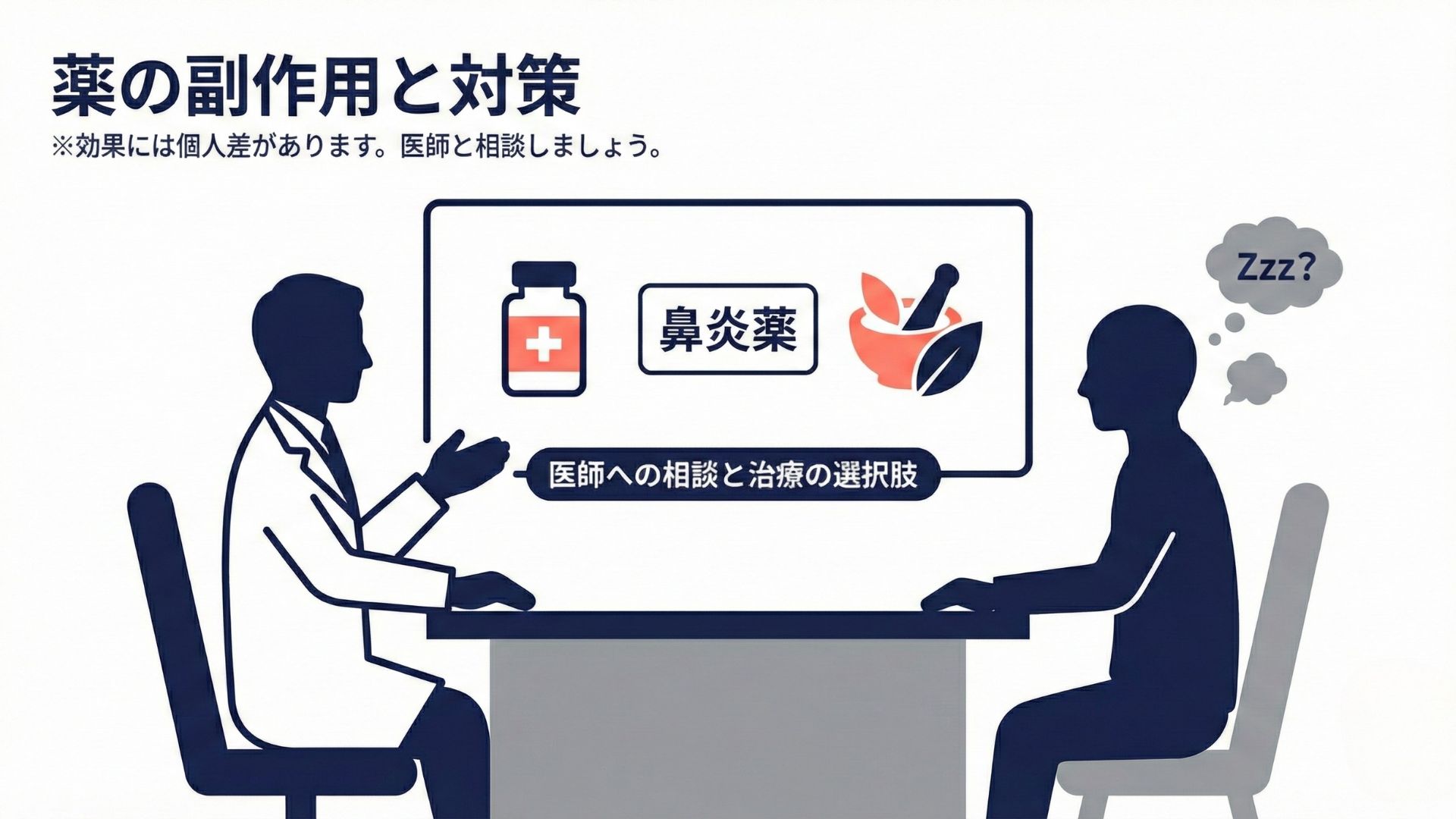 医師に相談することで、あなたの症状の重さや生活への影響を考慮した治療薬を選ぶことができ、副作用への対処も受けられます。その上で、「内科か耳鼻咽喉科なのか」、「処方薬か市販薬なのか」を病状に応じて選ぶことが大切です。