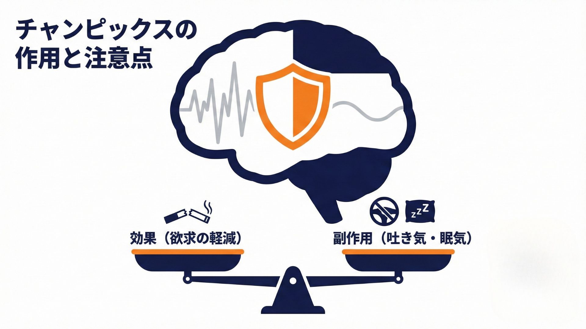 チャンピックス(有効成分:バレニクリン)は、禁煙外来で広く使われる飲み薬の禁煙補助薬です。脳内のニコチン受容体に部分的に結合し、タバコを吸ったときの「快楽(ドーパミン放出)」を減らし、離脱症状や強い「たばこを吸いたい」という欲求を和らげます。