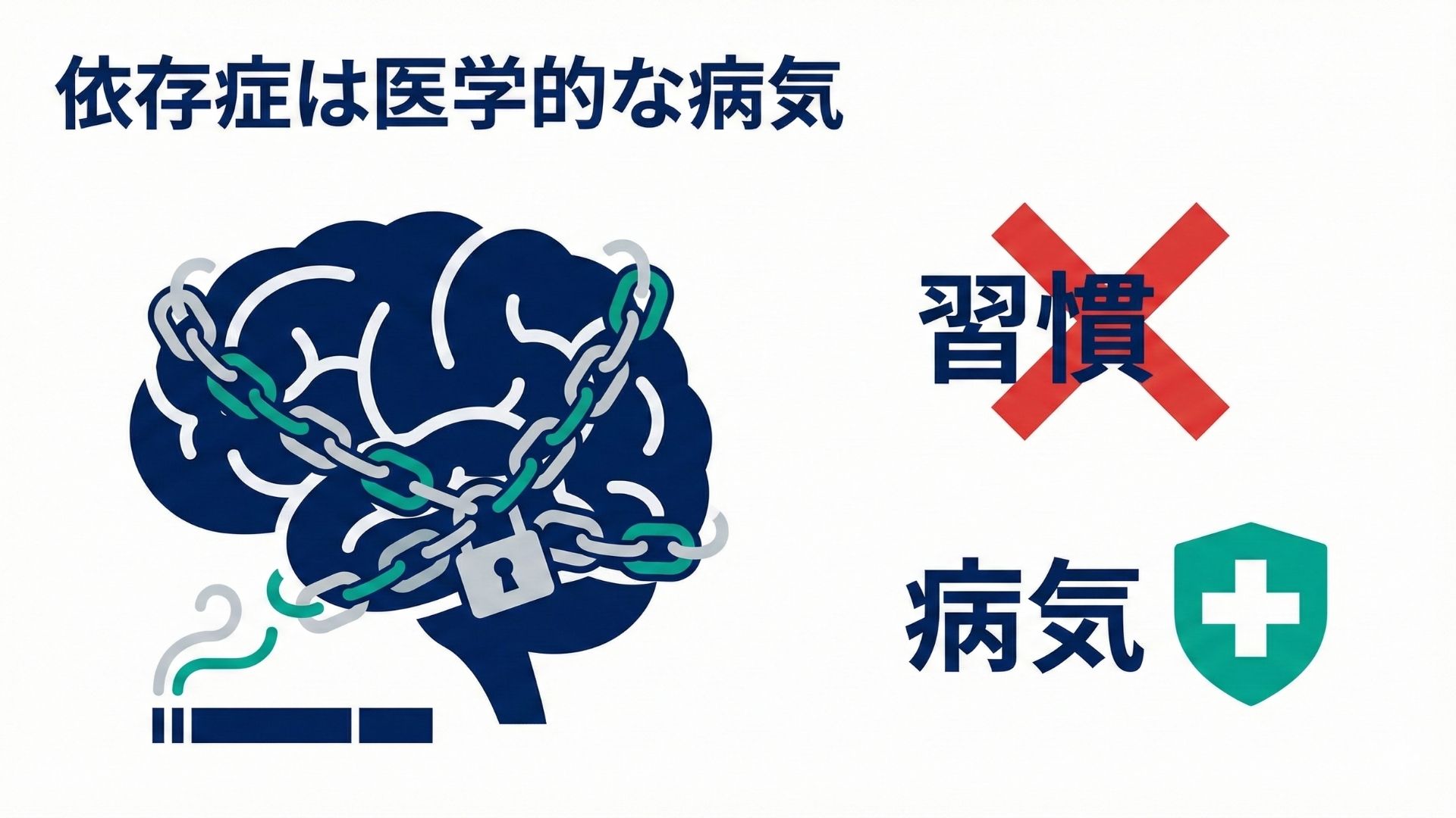 ニコチン依存症とは、タバコに含まれるニコチンが脳内の報酬系に作用し、喫煙がやめられなくなる病的な状態を指します。