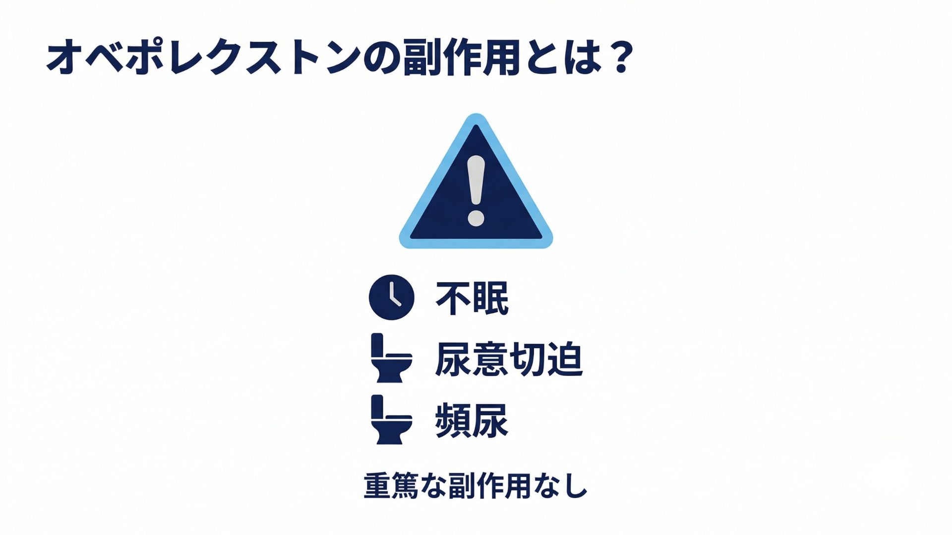 オベポレクストンは臨床試験で良好な忍容性を示しており、重篤な副作用は報告されていません 。主な副作用として報告されているものは、不眠(48%)がもっとも多い問題でした。ただし、殆どのケースで1週間以内に消失しています。次いで、尿意切迫(33%)、頻尿(32%)などがあります。