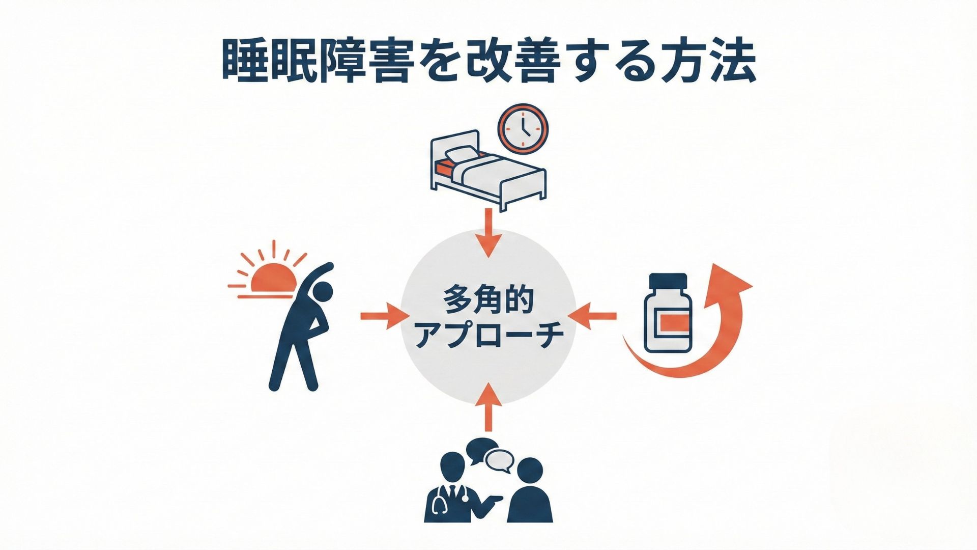 就寝と起床時刻を一定にすること、寝室環境の整備、就寝前の刺激物(アルコール、カフェイン)を制限することは、眠りの質を向上させるのに役立ちます。