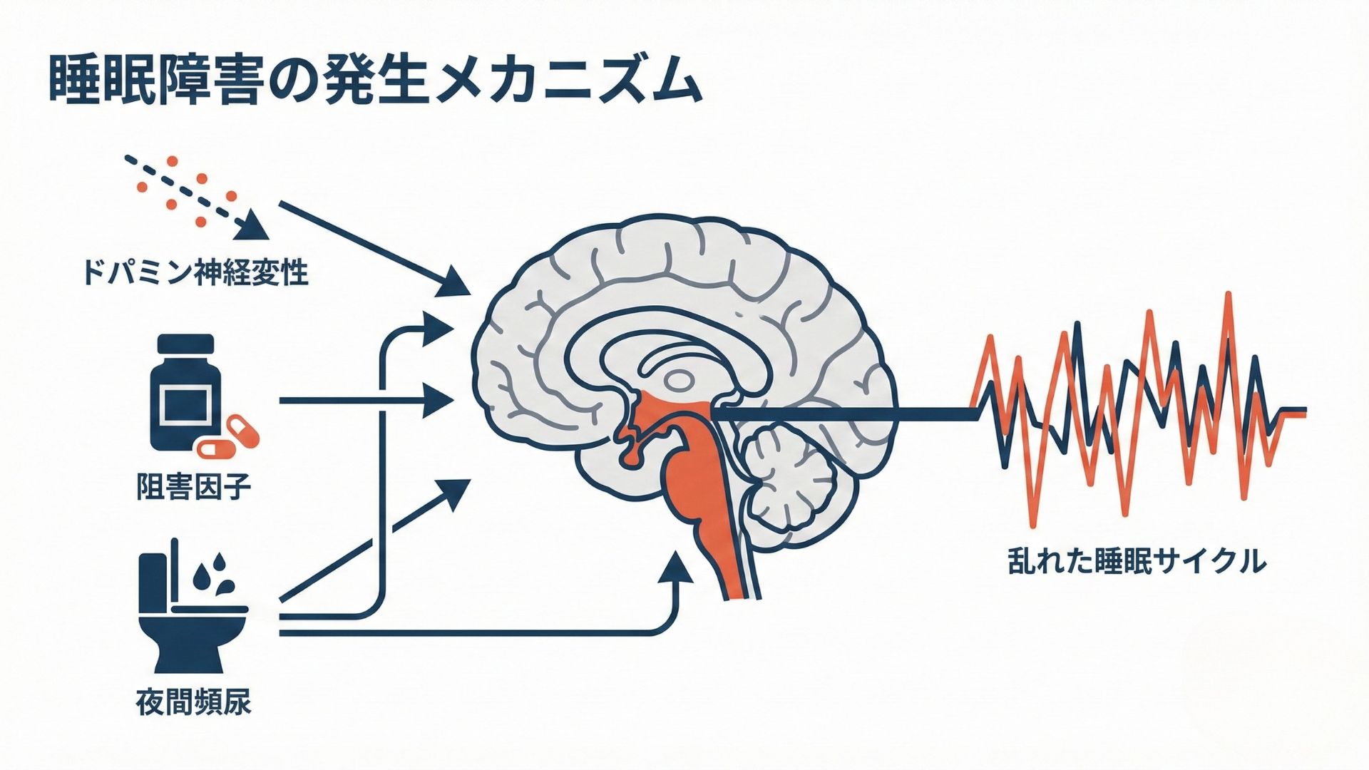 睡眠中枢に関係する脳幹や視床下部の神経回路が影響を受けると、入眠困難や中途覚醒、早朝覚醒といった睡眠障害が生じやすくなります。