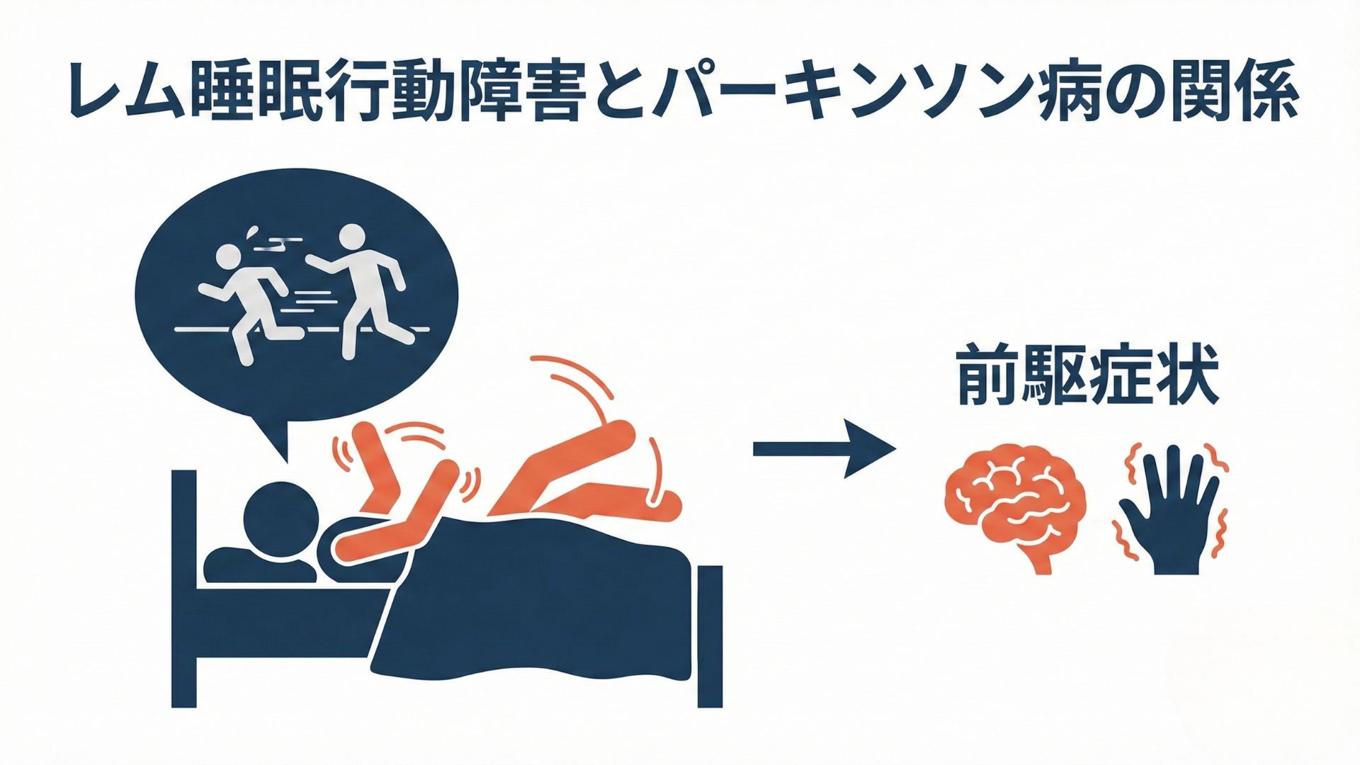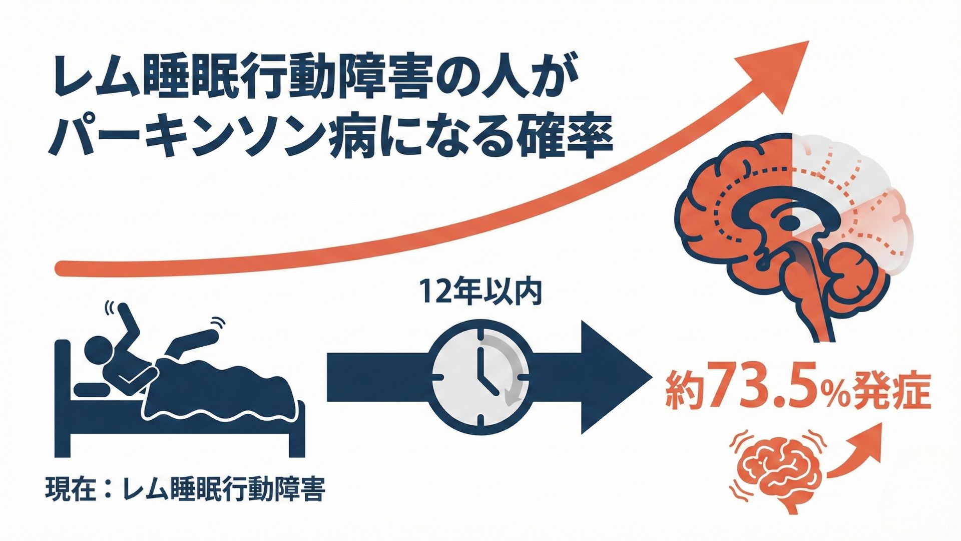 大規模研究では、「レム睡眠行動障害を有する人の約73.5%が12年以内にαシヌクレイノパシー(パーキンソン病など)を発症する」と報告されています。つまり、レム睡眠行動障害の存在は、将来のパーキンソン病の発症リスクが高いというサインとなることを意味します。