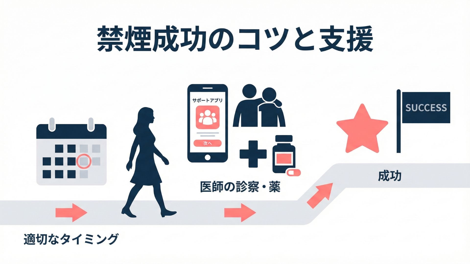 禁煙成功の鍵は、適切なタイミング設定、計画、支援の活用、こころの準備です。禁煙を始める際には、月経周期や妊娠希望の有無などを考慮し、ストレスの少ない時期を選ぶことがポイントです。
