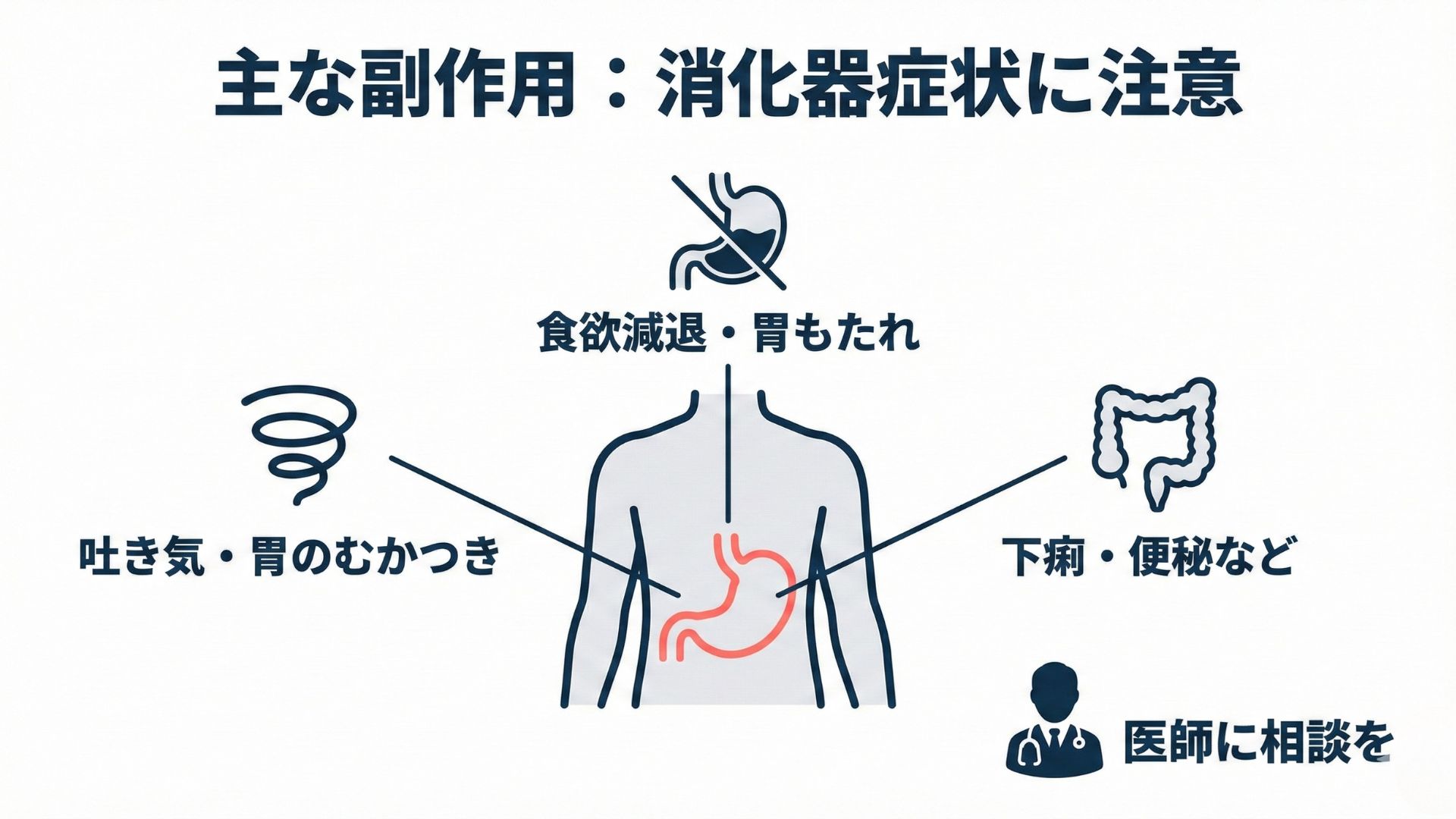 リベルサスの内服では、吐き気・胃もたれ・食欲低下などの消化器症状が起こることがあります。
