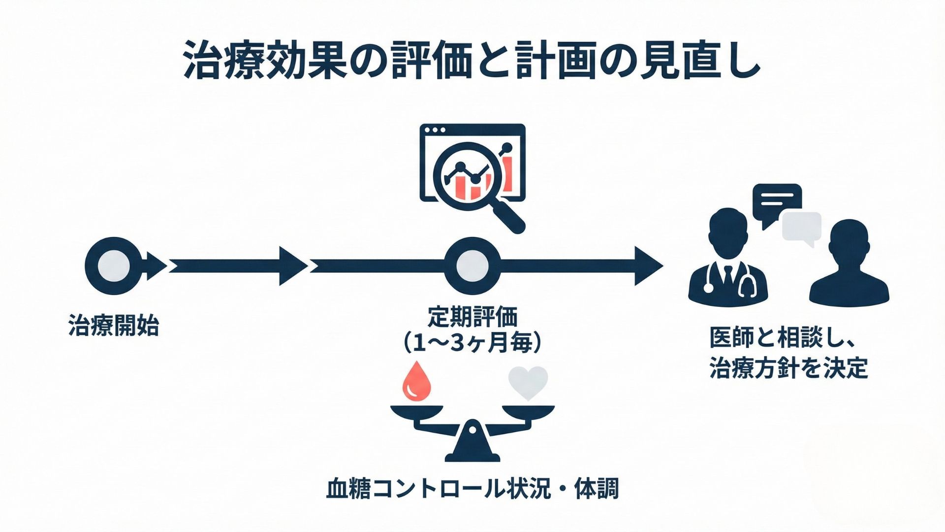 効果は1〜3か月で評価し、目標とする血糖コントロールが達成されたら見直します。