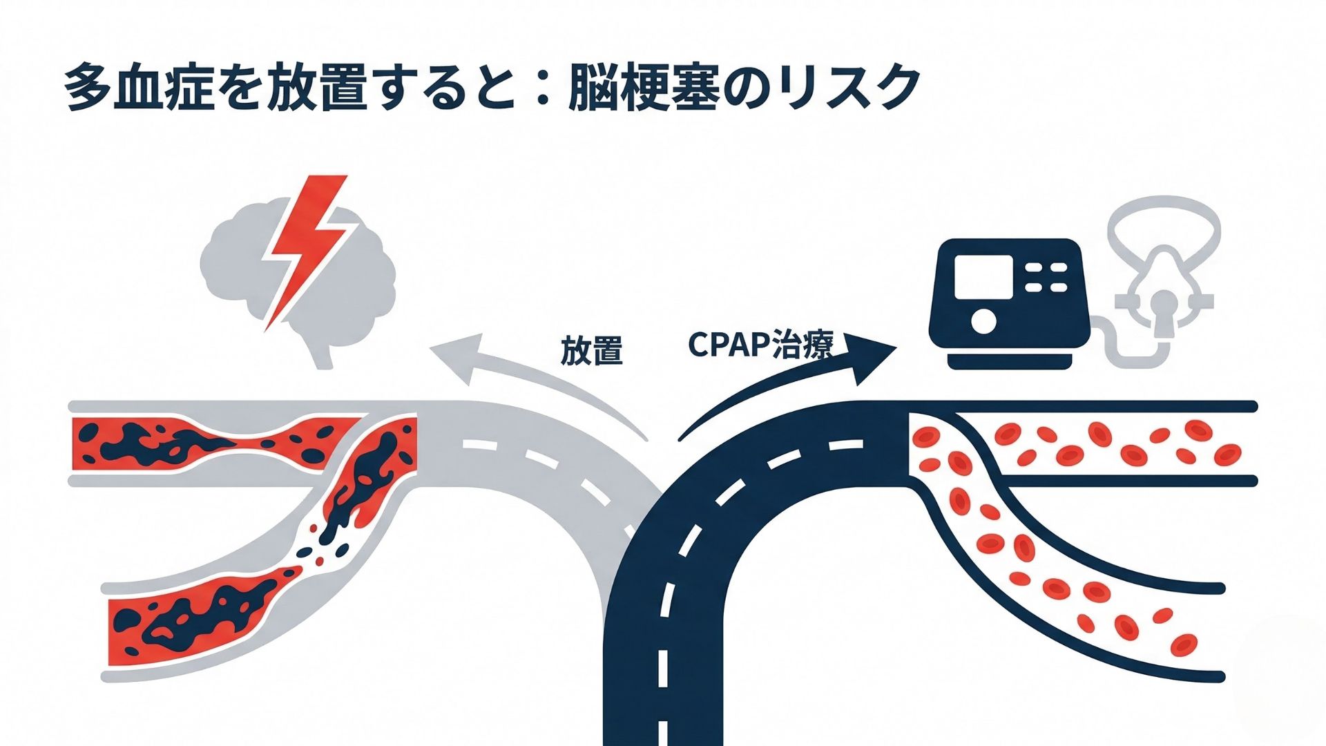 正直に申し上げると、多血症を放置すれば脳梗塞で命を落とすリスクが増します。その一方、睡眠時無呼吸症候群のCPAP治療の身体的なリスクは殆どありません。