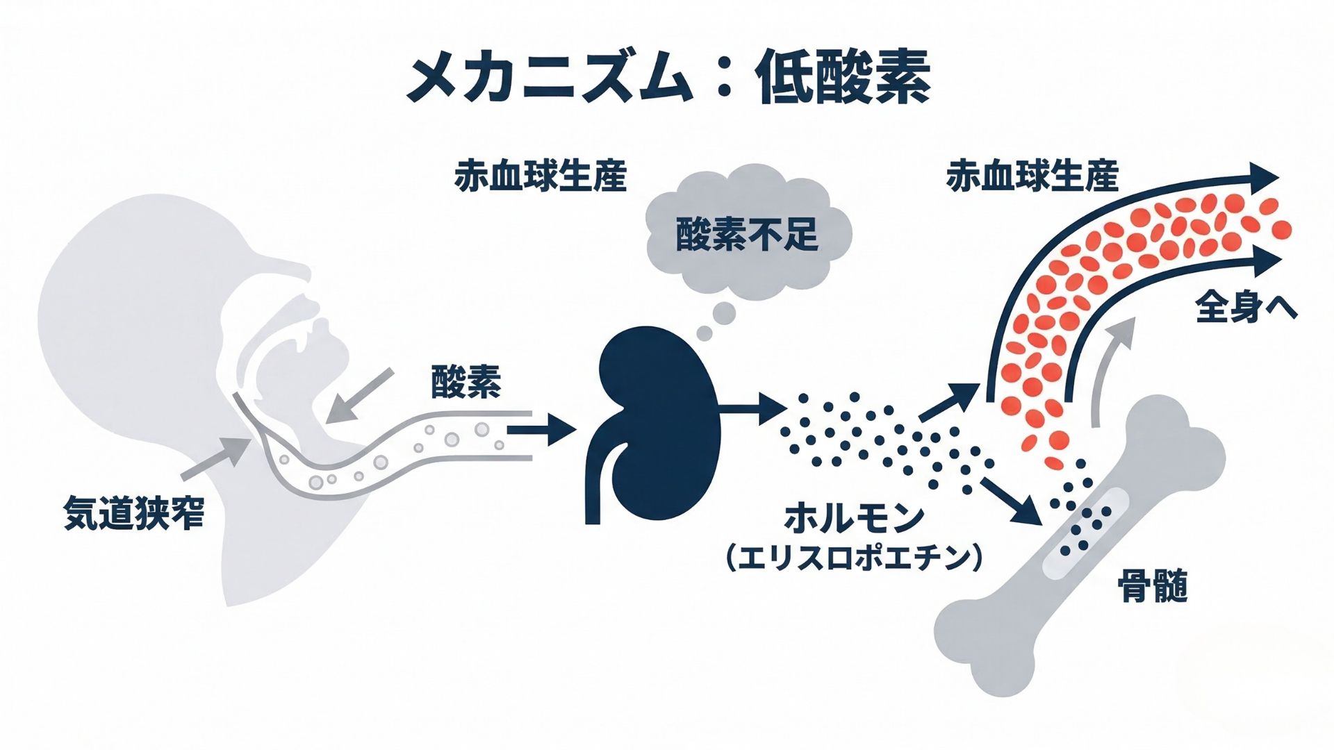 毎晩、寝ているときに低酸素血症が続くと、体が赤血球を増やして酸素の運搬を補おうとするからです。