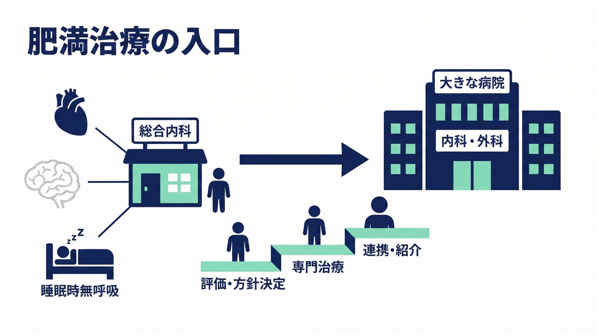 まずは内科で合併症をまとめて評価し、食事、運動、睡眠の見直しから始めます。その上で、健康保険で使える薬が適応になるのか、高度肥満症であり外科手術を検討すべきかを見極めて、大きな病院へ紹介する方法が合理的です。