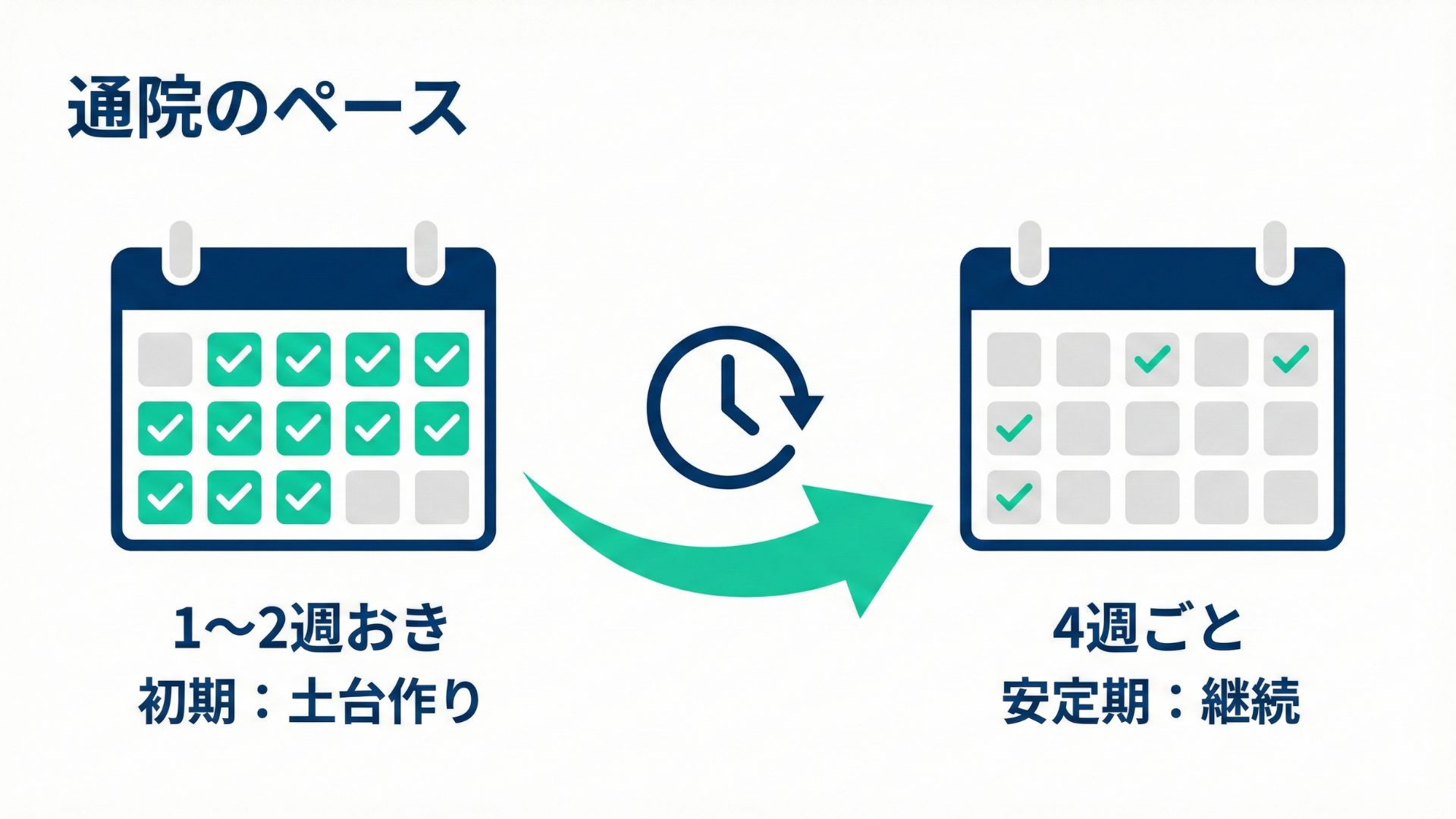 初診から再診の2回目までは1〜2週おき、その後は4週ごとに間隔を空けて続けるのが基本です。