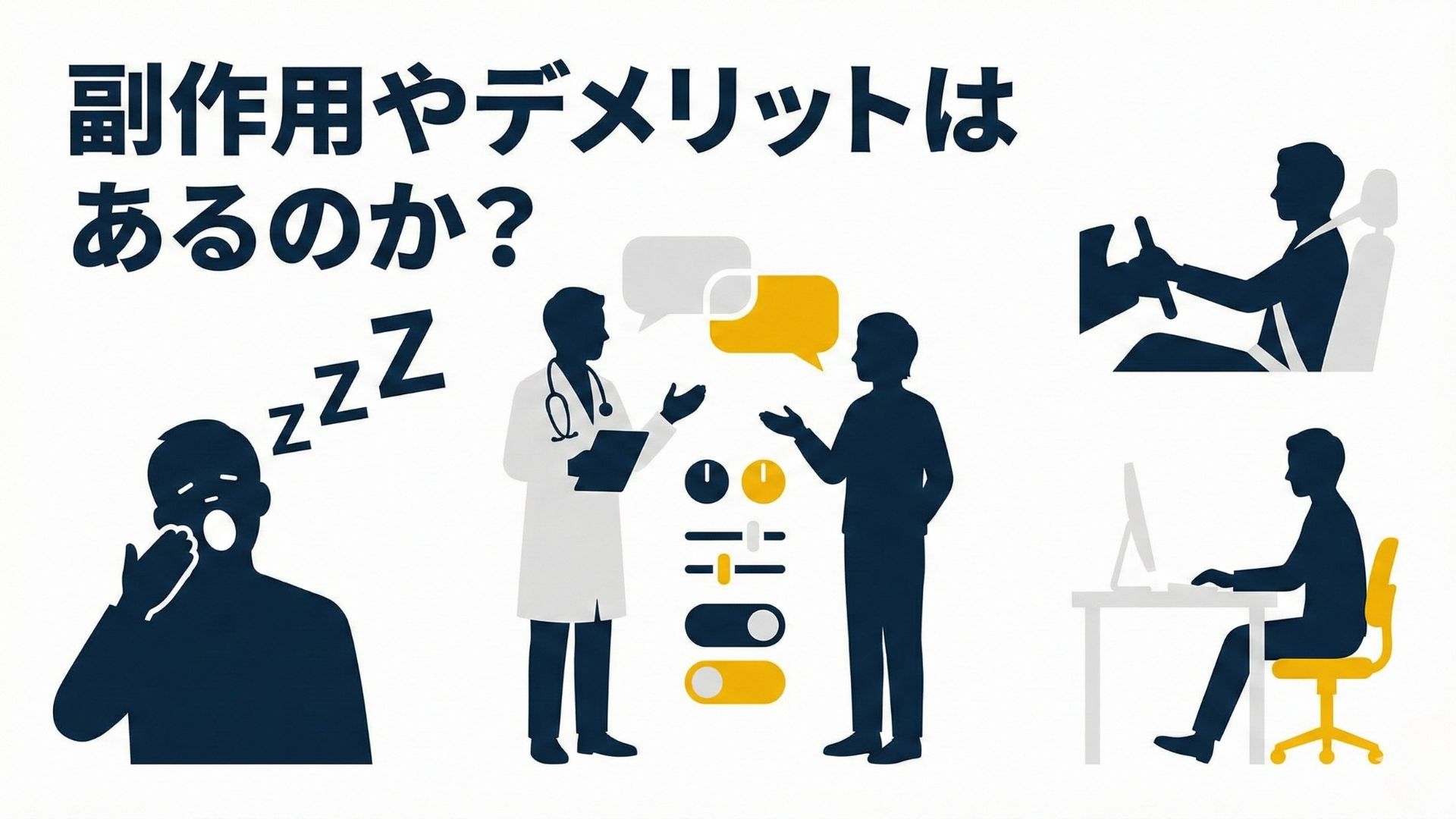 副作用が怖い場合は、仕事や運転の有無、生活リズムを医師に伝えることで回避できます。副作用は「我慢するもの」ではなく、「調整するもの」です。自己判断で服用を急に止めてしまうことが、症状の増悪という別のリスクを生みます。