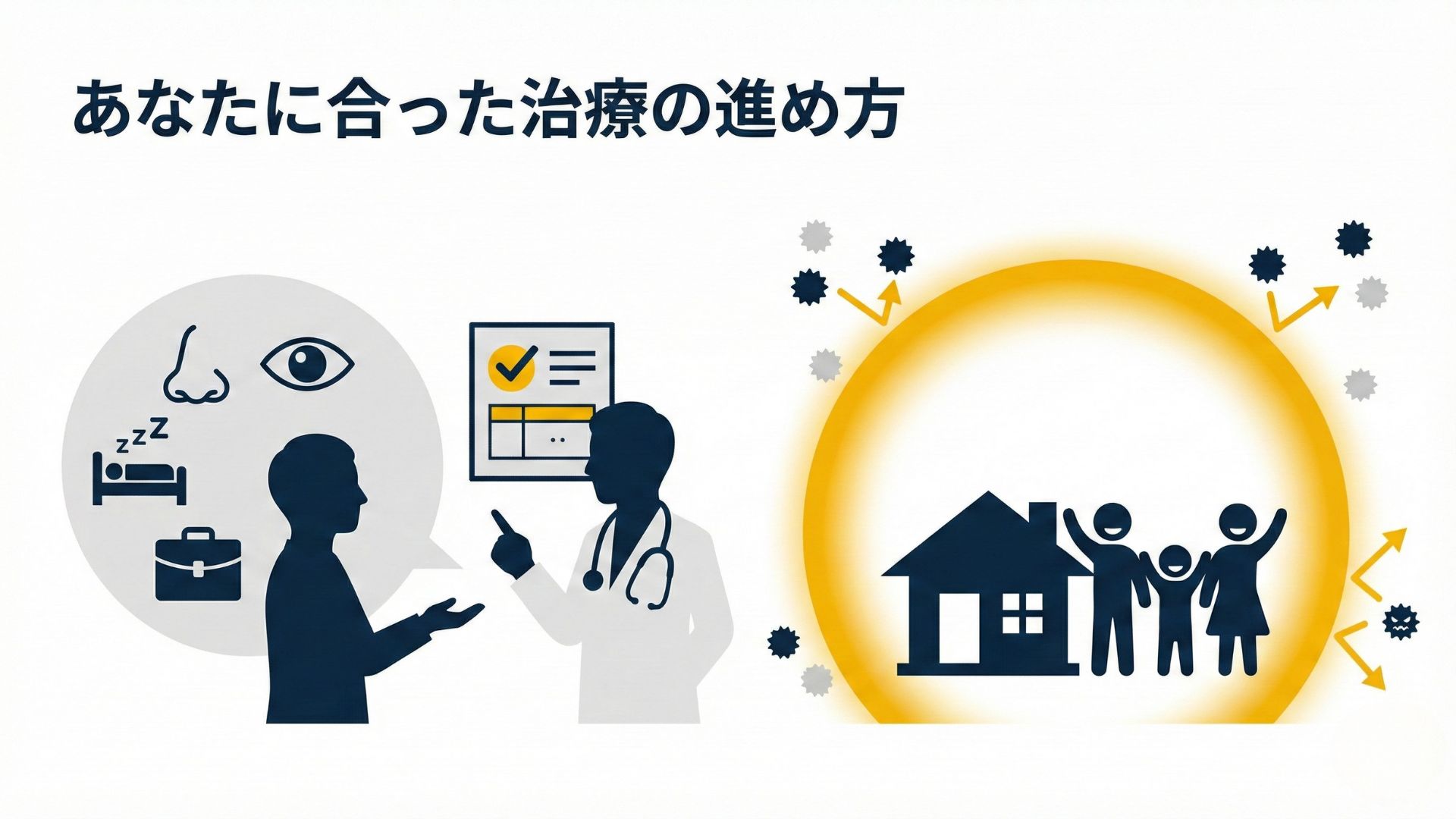 「毎年同じで仕方ない」と我慢する治療から、「生活の質を維持するための治療」へ切り替えることが目標です。